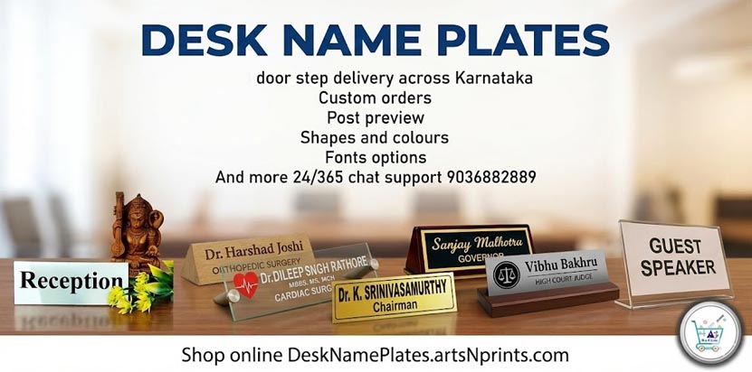 Door Name Plates | Door Number Plates for Hotel, Lodges and flats | Custom Car Number Plates | Custom Bike Number Plates | HSRP Font Number Plate | Acrylic Name Plates for home and offices | Metal Name Plates | Wooden Name Plates | Planter Name Plates | Surname Logo Name Plates | Desk Name Plates | Individual Number & Letters | Office & Industries Signs | Modular Signs | Glow Signs | Safety Signs | Banners | Promotion Material Sunpack | Writing Boards | Rubber Stamp & Seals | Wall Decors | all Kinds of Cards (Marriage, Business, Invitation Etc.) | Danglers | Posters | Custom and Hotel Keychains | Custom print & Cut Stickers | Vehicle and Wall Decals | Epoxy Dome Stickers | Window Decor Sun Control Films | Stencils | Bookmarks | Custom Printed T-Shirts | Pocket Badges | Printed Coffee Mugs | Custom Awards and Trophies | Corporate Gifts | Wristbands | Flags | Podium | Letter Boxes