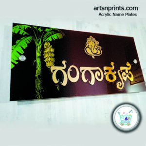 Elegant Kannada acrylic name plate featuring Ganesha symbol and banana tree design, crafted with premium glossy acrylic and golden lettering.