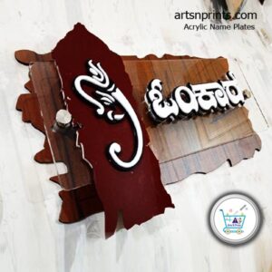 “Omkara Kannada Acrylic Name Plate with Ganesha Motif and Wooden Finish | Designed by Karnataka.artsnprints.com”